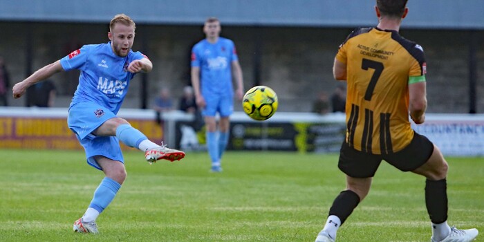 Rory Smith was next to try his luck; seeing the Folkestone goalkeeper off his line, an adventurous chip from distance sailed the wrong side of the crossbar. At this point, the game increased in tempo with referee Goldup giving out the first stern telling-off to Folkestone’s Joel Odeniran having cynically bringing down BC in the middle of the park.