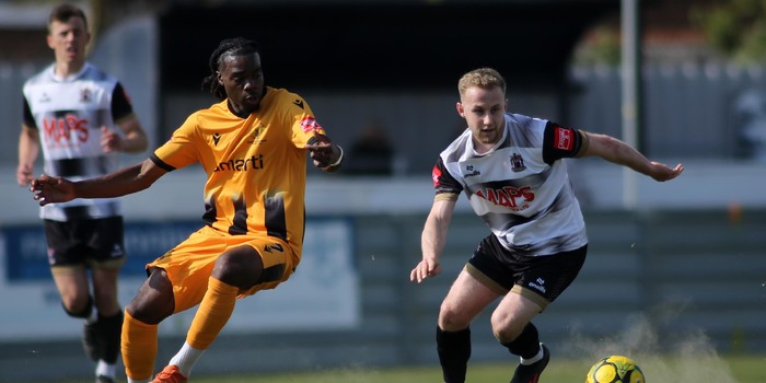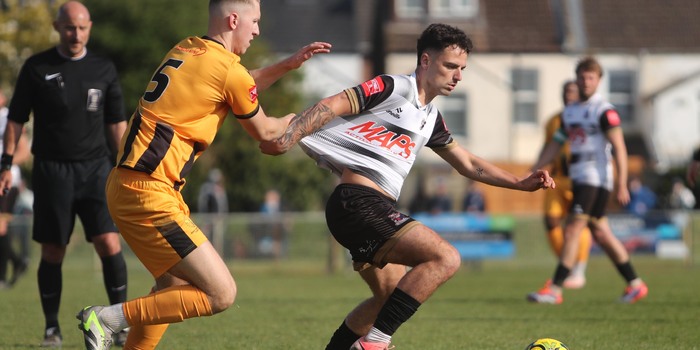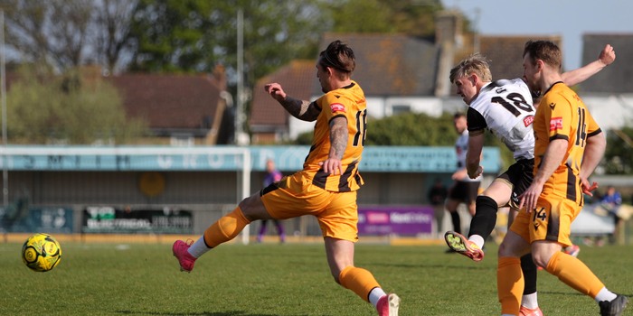 Nicknamed the Wasps, the Sussex visitors didn’t offer much of a sting footballing-wise anywhere after that, but Drew Cooney’s team certainly couldn’t be accused of being afraid to get involved in the physical stuff. With the Deal players determined to stand their ground, the contest gradually developed into a scrappy “slugging match”, with frequent injury stoppages and referee Dave Rowland showing several yellow cards.