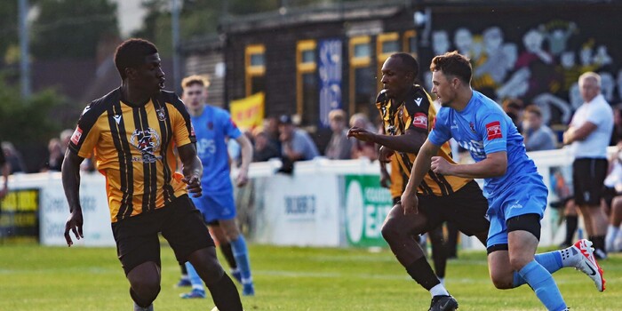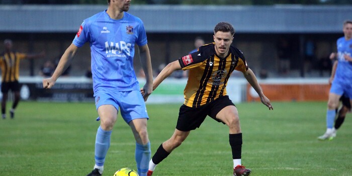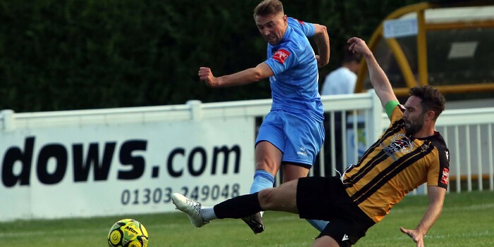 Rory Smith was next to try his luck; seeing the Folkestone goalkeeper off his line, an adventurous chip from distance sailed the wrong side of the crossbar. At this point, the game increased in tempo with referee Goldup giving out the first stern telling-off to Folkestone’s Joel Odeniran having cynically bringing down BC in the middle of the park.