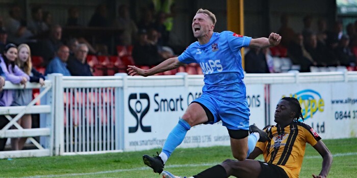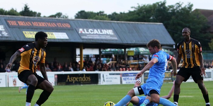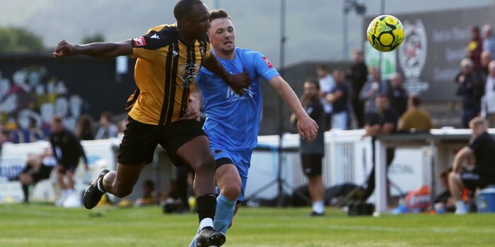 The break worked in Folkestone’s favour. Coming out rejuvenated, no doubt following some heavy encouragement from Andy Drury, Adam Molloy was called into immediate action. A good cross from Frankie Morgan and a powerful header from the Folkestone forward ended in Molloy palming onto the post, eventually cleared to safety from Foster. Seconds later, and almost a copy of the first move, Morgan delivered to find Ian Gayle who headed home to half the deficit (50’).