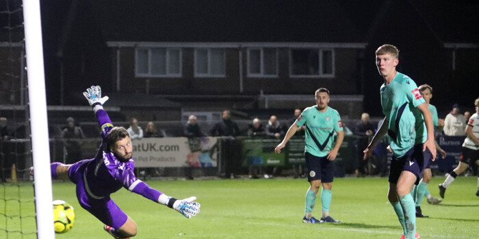 Eastbourne took 45 minutes to establish their first chance, and what a chance it was. A corner sent deep into the area found the head of the Eastbourne 9; Tonkin pulling out an unbelievable save to ensure the Hoops went into half time two to the good.